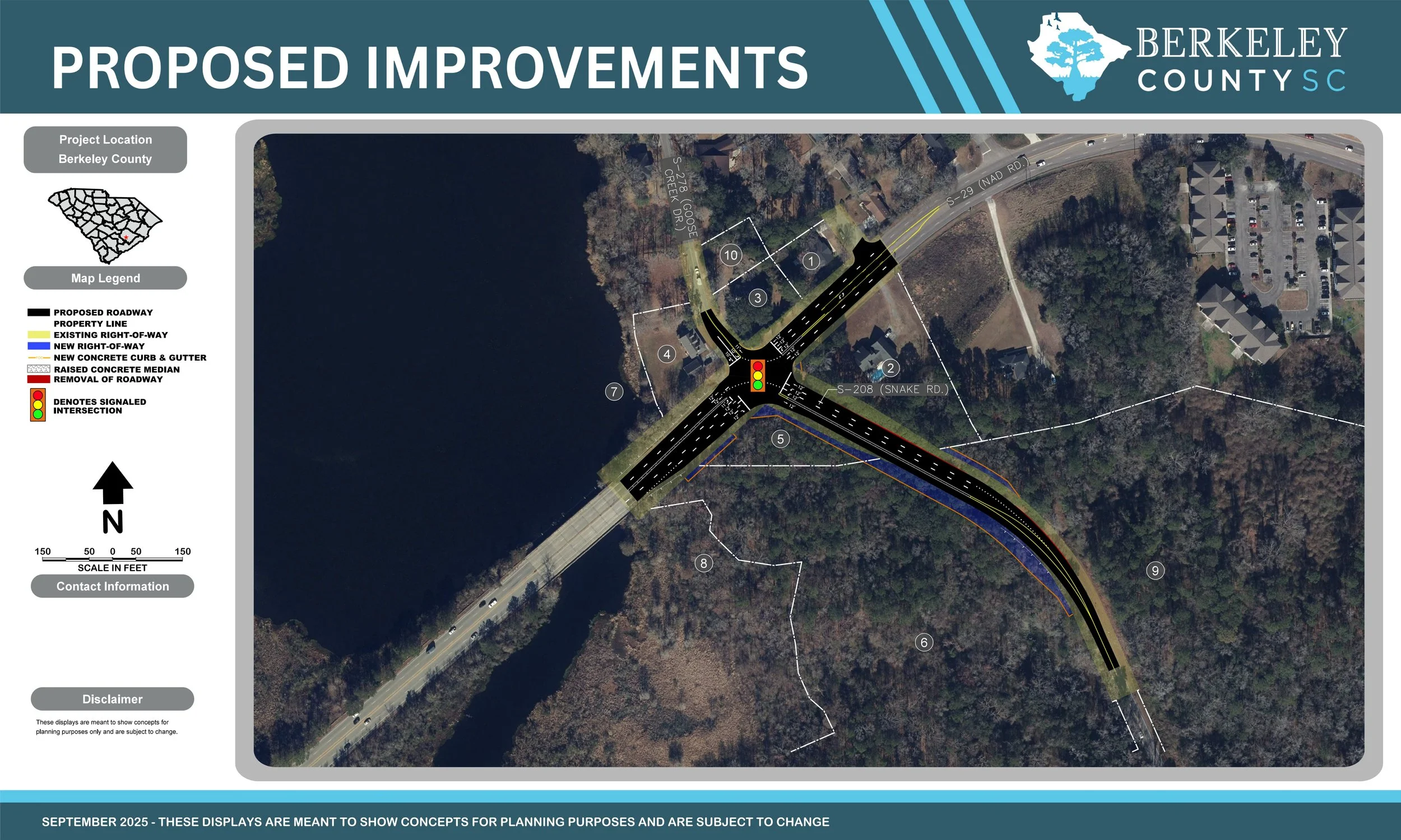 An open house public information meeting was held for the Berkeley County Snake Road and NAD Road Intersection Improvements project on September 25, 2025 from 5:30 - 7:30 p.m. at the Goose Creek Elementary Multi-Purpose Room (200 Foster Creek Rd., Goose Creek, SC 29445).